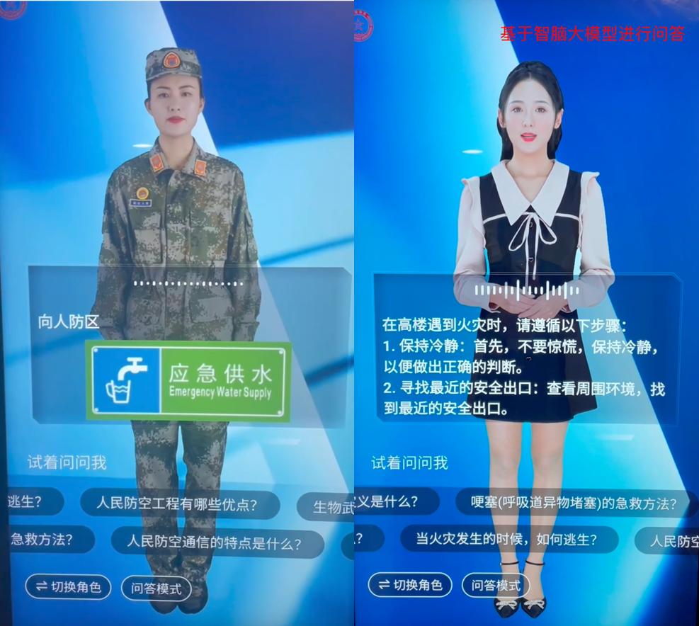 这使得数字人在教学上不仅能输出关于人防的专业知识,还能实时从全网范围内进行信息搜索、整理并输出,满足学生个性化学习需求。针对特定场景,数字人可以将人防问题知识点与图片、视频进行匹配结合,实现图文和视频的智能化展示,突破学校教学内容生产的瓶颈,省心省力降本增效。