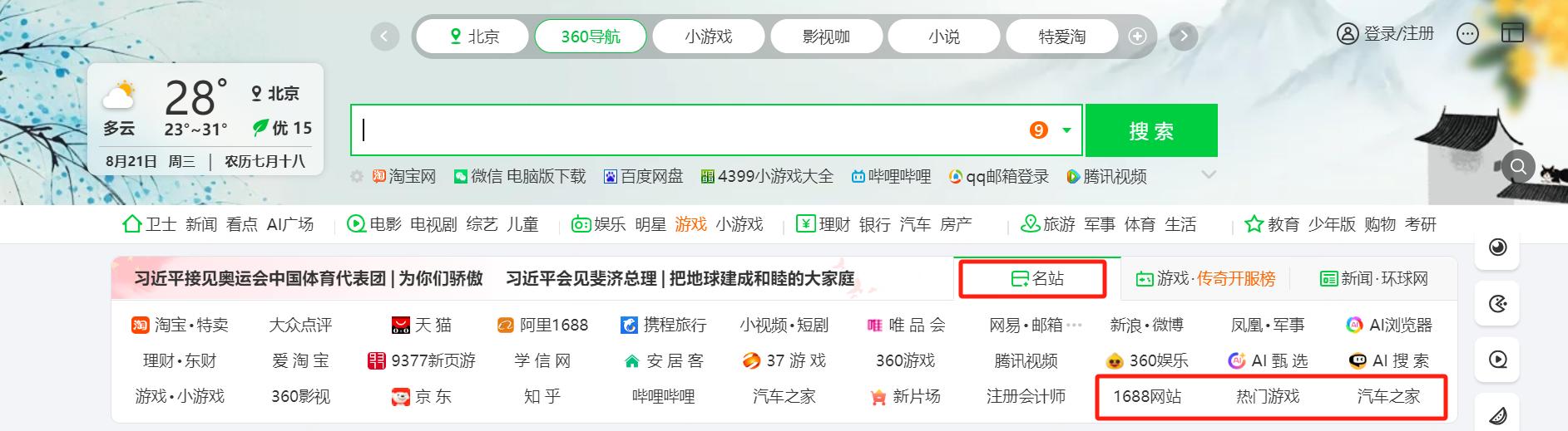 启明星-名站所在的位置为360安全浏览器导航页第一屏,占位醒目,方便第一眼进入用户视野,强化用户的品牌认知。此外,名站还聚集了京东、淘宝等一众知名品牌,为中小企业提升市场影响力带来了积极的促进作用。