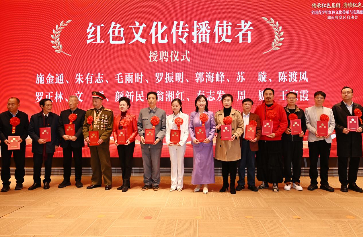 3月31日,全国青少年红色文化传承与实践创新大赛湖南赛区启动仪式顺利举行,施金通、朱有志、毛雨时、罗振明等一批扎根湖湘红色沃土、深耕红色文化传承一线的榜样人物,被正式聘任为湖南赛区首批红色文化传播使者,将以榜样之力为湖湘青少年红色传承之路引路领航,用实际行动传递红色信仰、赓续红色血脉。